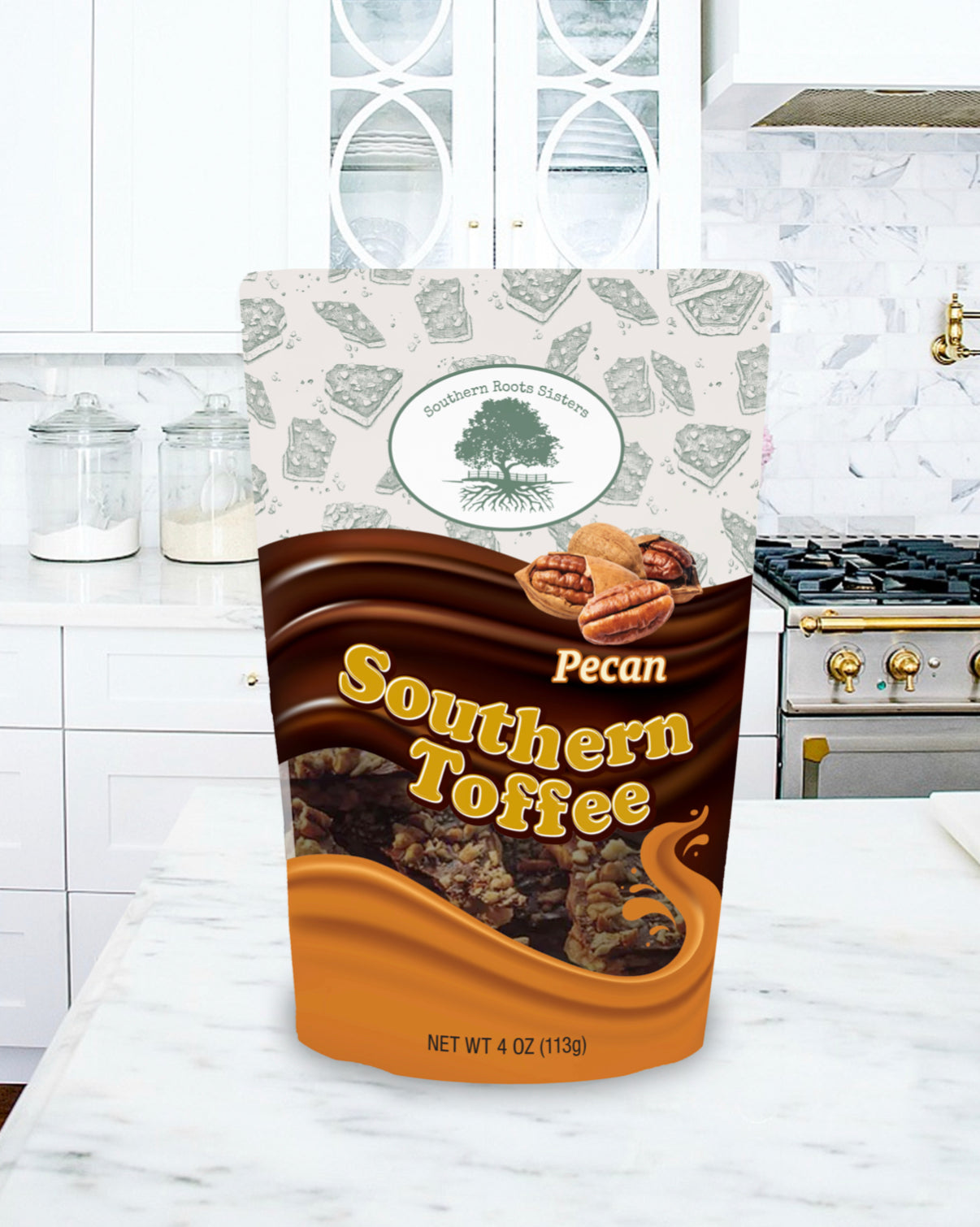 Southern Pecan Toffee by Southern Roots Sisters is a decadent treat made from buttery toffee, local pecans, and a layer of chocolate. It has a rich, buttery flavor and a crunchy texture from the toasted pecans. The toffee is made with high-quality ingredients and is hand-crafted in small batches to ensure that each piece is of the highest quality. The toffee is finished with a layer of smooth chocolate for an extra touch of indulgence. It's the perfect gift for any chocolate and nut lover or a delicious treat to enjoy on your own. Try breaking it into pieces and using it as a topping for ice cream or yogurt for an extra special dessert.These are best consumed within 3 months of manufacture date and can be placed in the freezer for an additional 3 month shelf life.